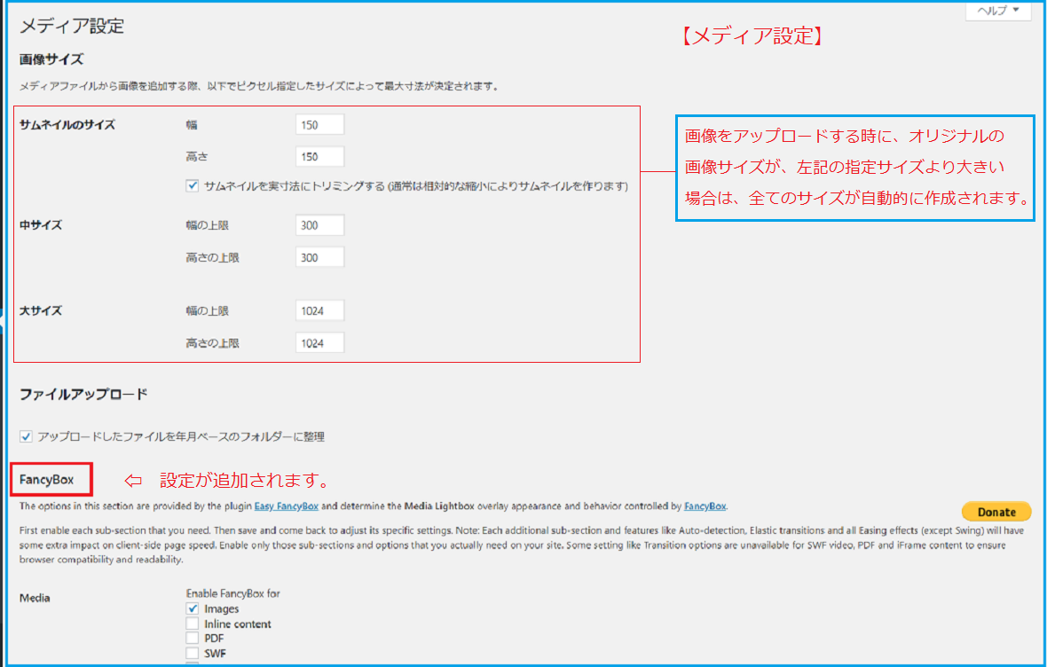 Easy FancyBoxプラグインをインストールすると、Wordpress「メディア設定」にEasy FancyBox の設定が追加されます。